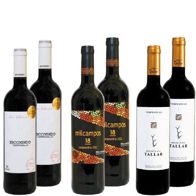 Incluye 2 botellas de Señorío del Tallar 10 Meses, elegante y expresivo; 2 botellas de Milcampos Reserva 18 Meses, amplio y envolvente; y 2 botellas de Escondido Gran Selección 24 Meses, potente y complejo, la cima de la colección.